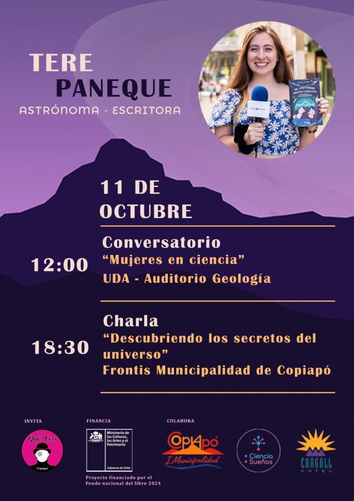 La destacada astrónoma y escritora, Tere Paneque, visitará la capital regional. El próximo viernes 11 de octubre, la astrónoma PhD, divulgadora científica, embajadora Unicef y escritora Tere Paneque se presentará en el frontis de la Municipalidad de Copiapó en una jornada que promete destacar tanto en el aspecto científico como en el literario. La alcaldesa […]